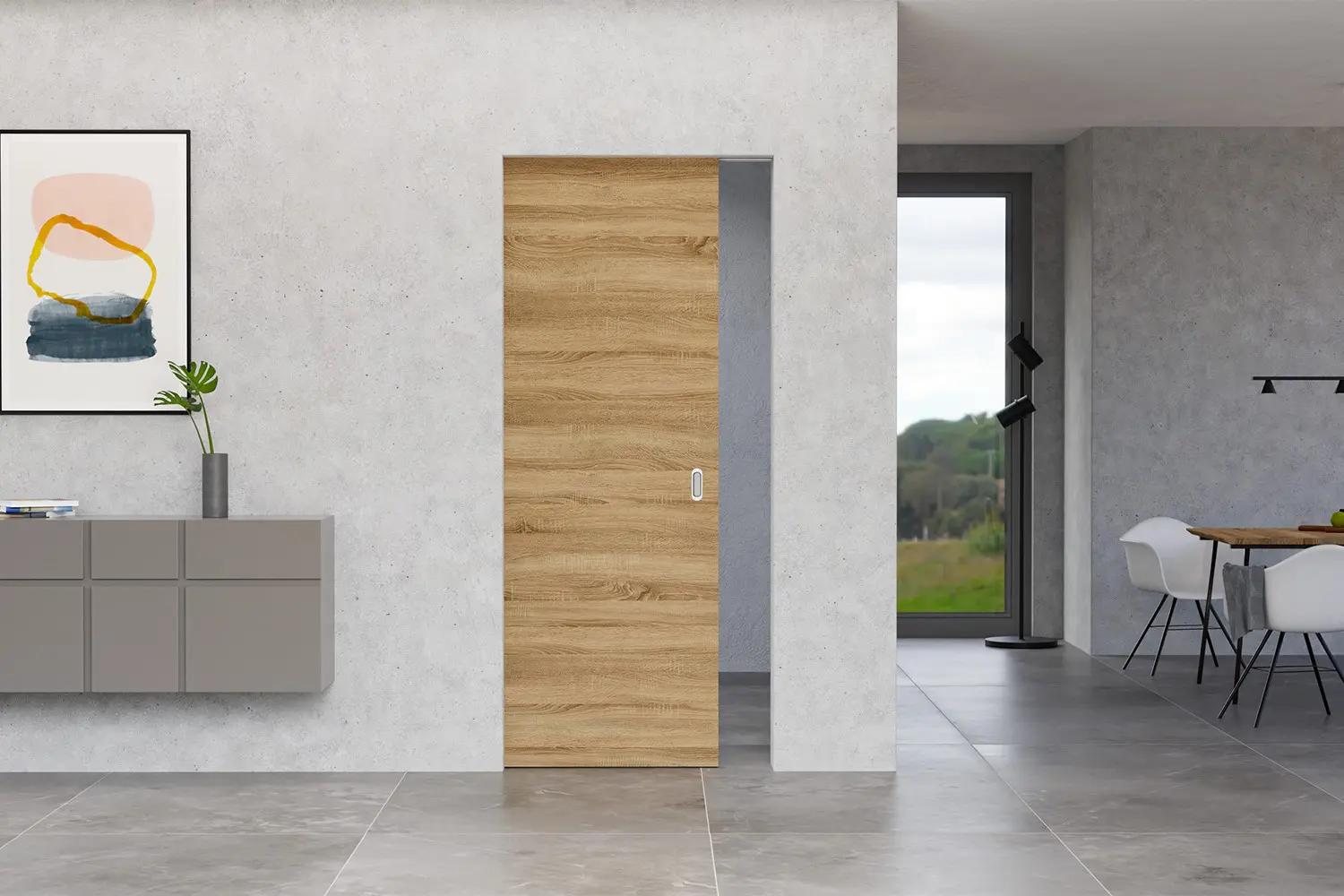 - Die Schiebetür läuft praktisch geräuschlos und leicht in der Wand. Sie lässt sich komplett unsichtbar in der Wandtasche versenken.